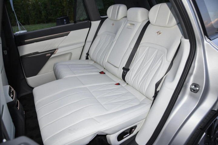内饰设计中规中矩,不算出彩,但也没什么毛病,简约的内饰布局,看上去还是比较清爽的,配备D型双辐式多功能方向盘、10.25英寸液晶仪表、15.6英寸悬浮式中控屏,另外车型还标配了流媒体后视镜和15.6英寸2.5K分辨率的后排吸顶娱乐屏。